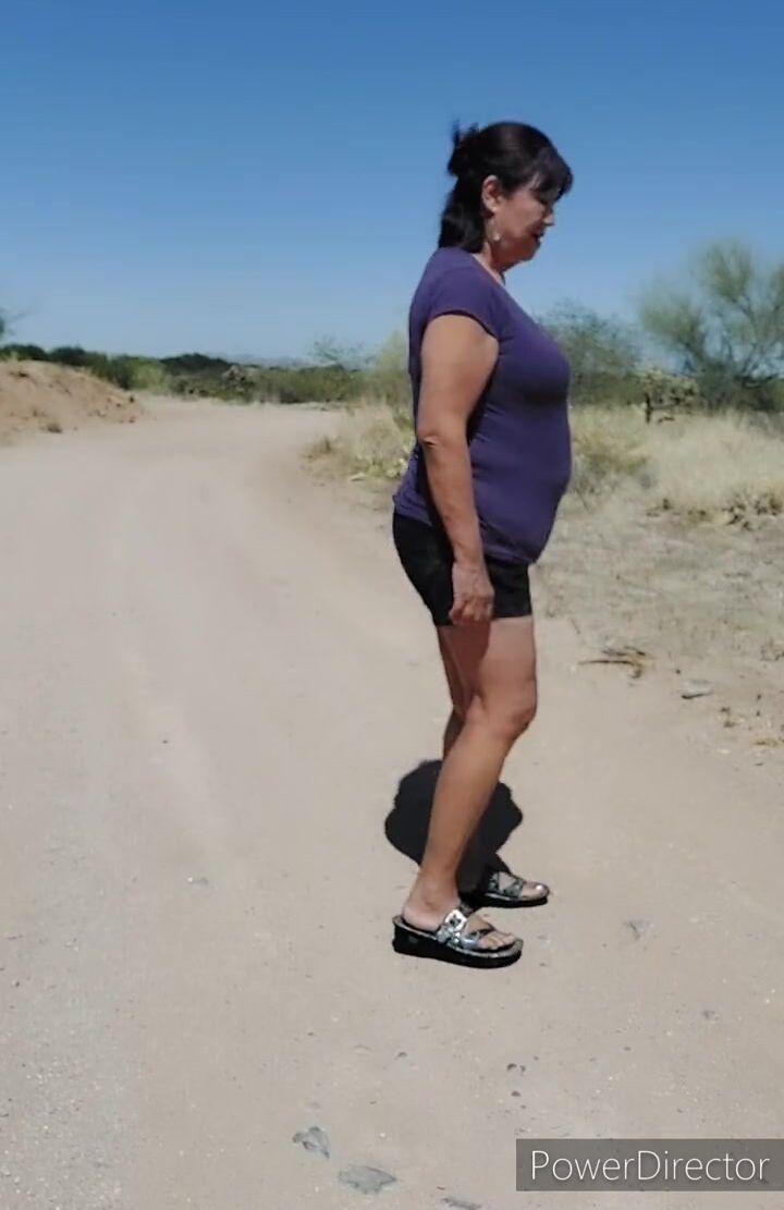 Stopping to piss by the side of the road. Mature Latina with darker pussy & ass than the rest of her body