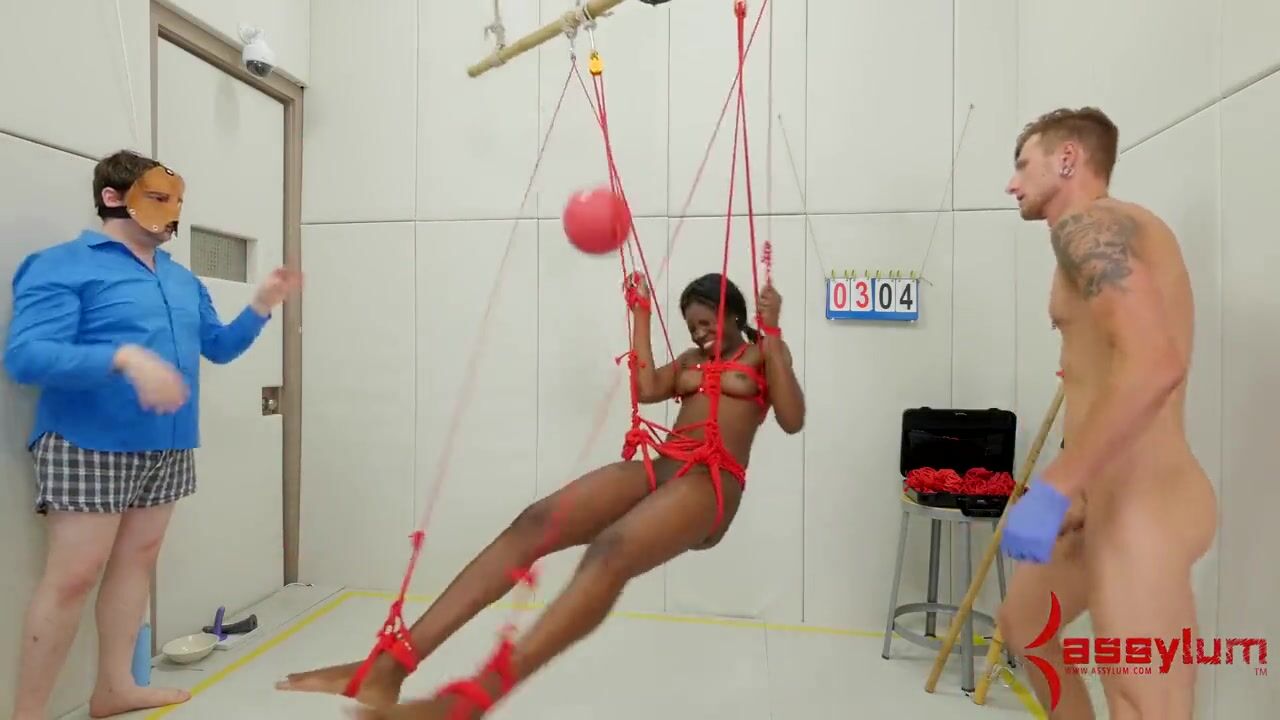 Bound ebony submissive hanging from ceiling