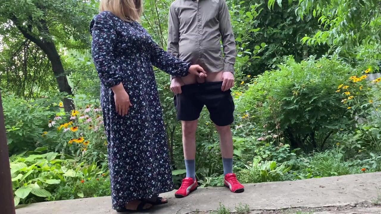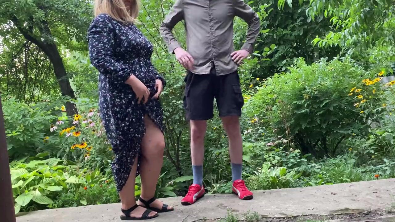 Mommy MILF helps her stepson pee outside and pee standing herself