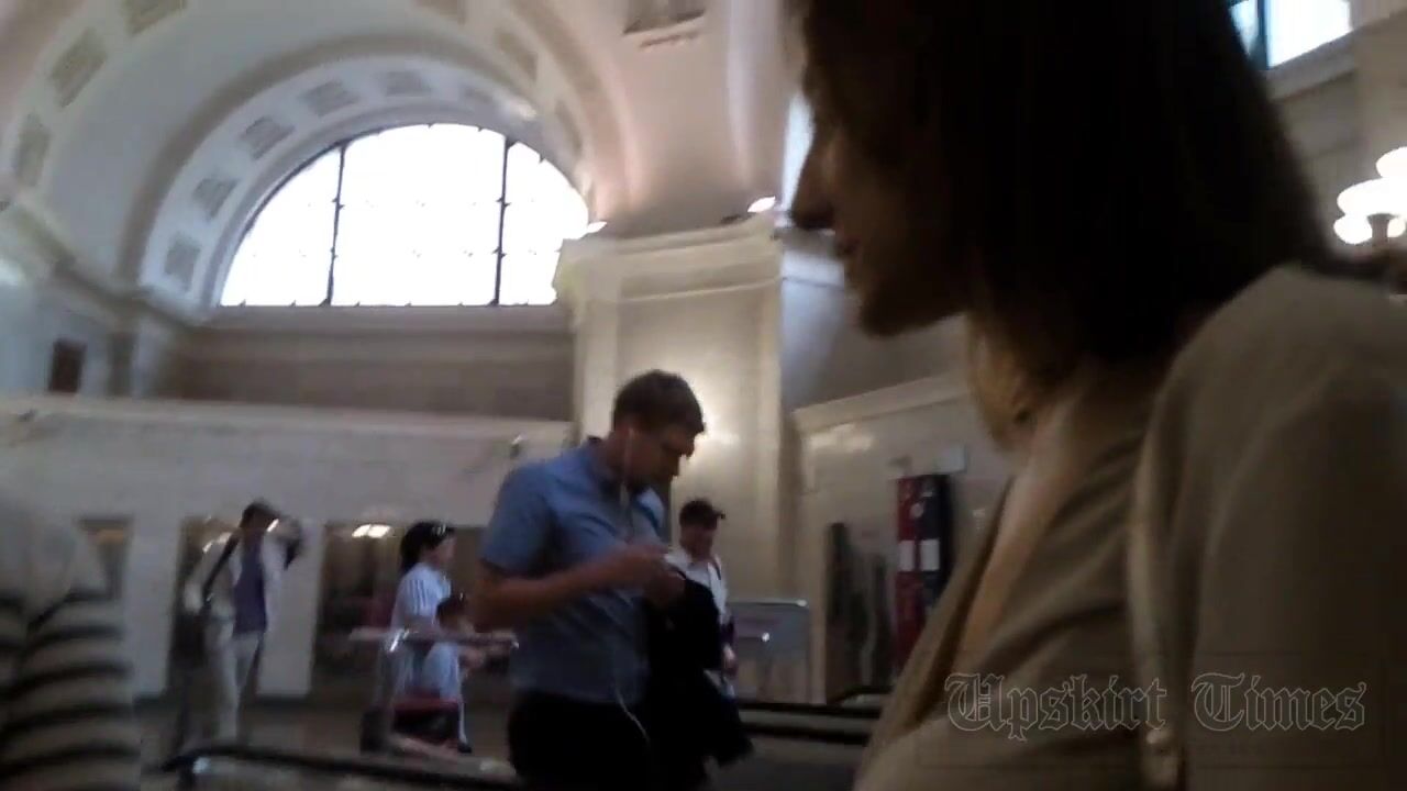 Upskirt of a slender girl on an escalator in the subway.