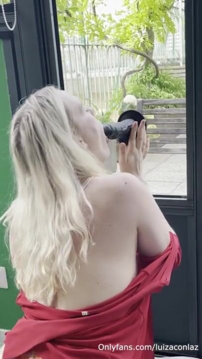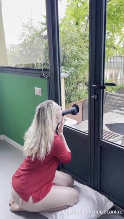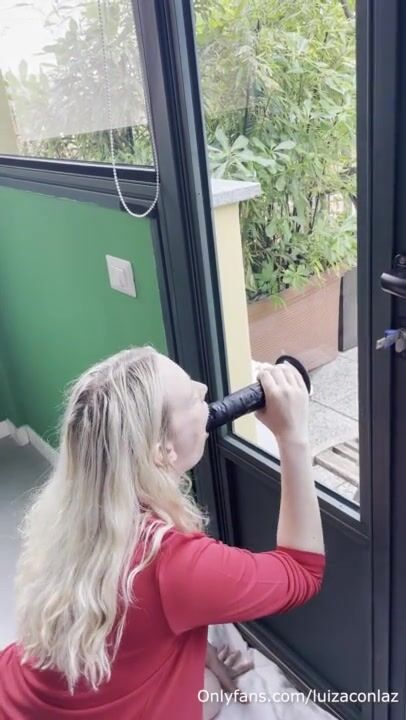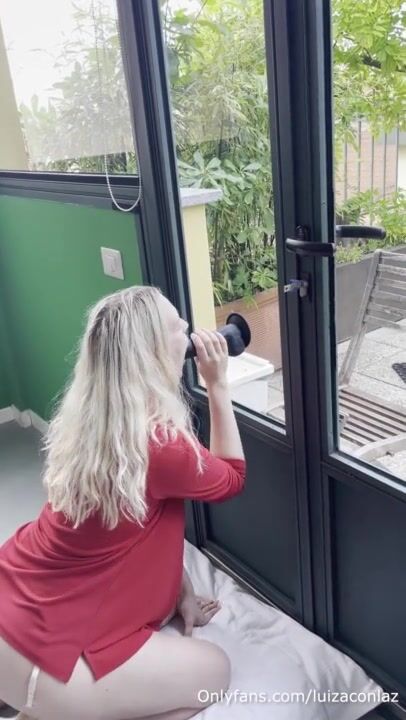 Horny blonde with big tits sucks a suction cup dildo in front of the window