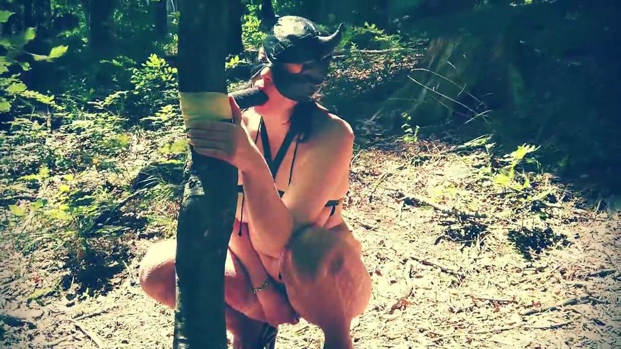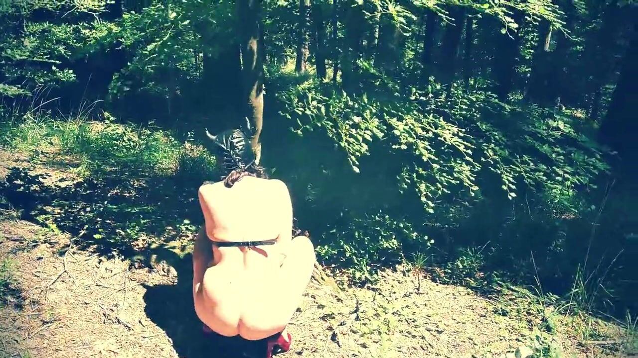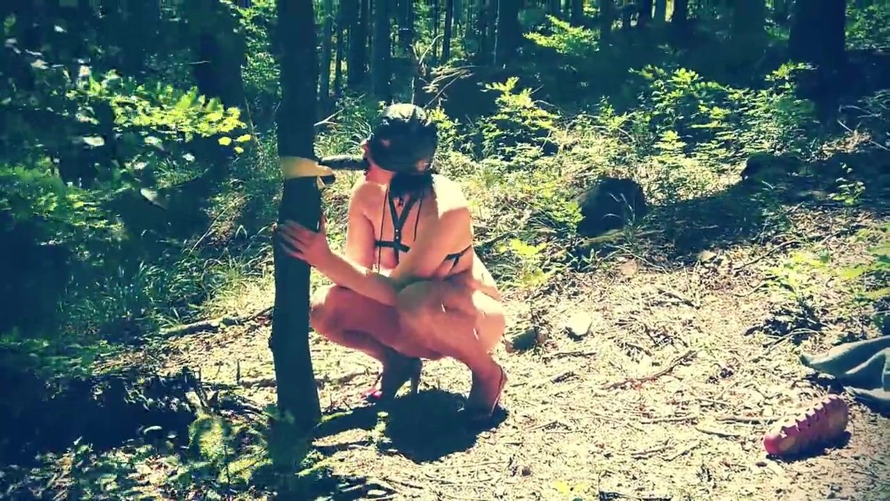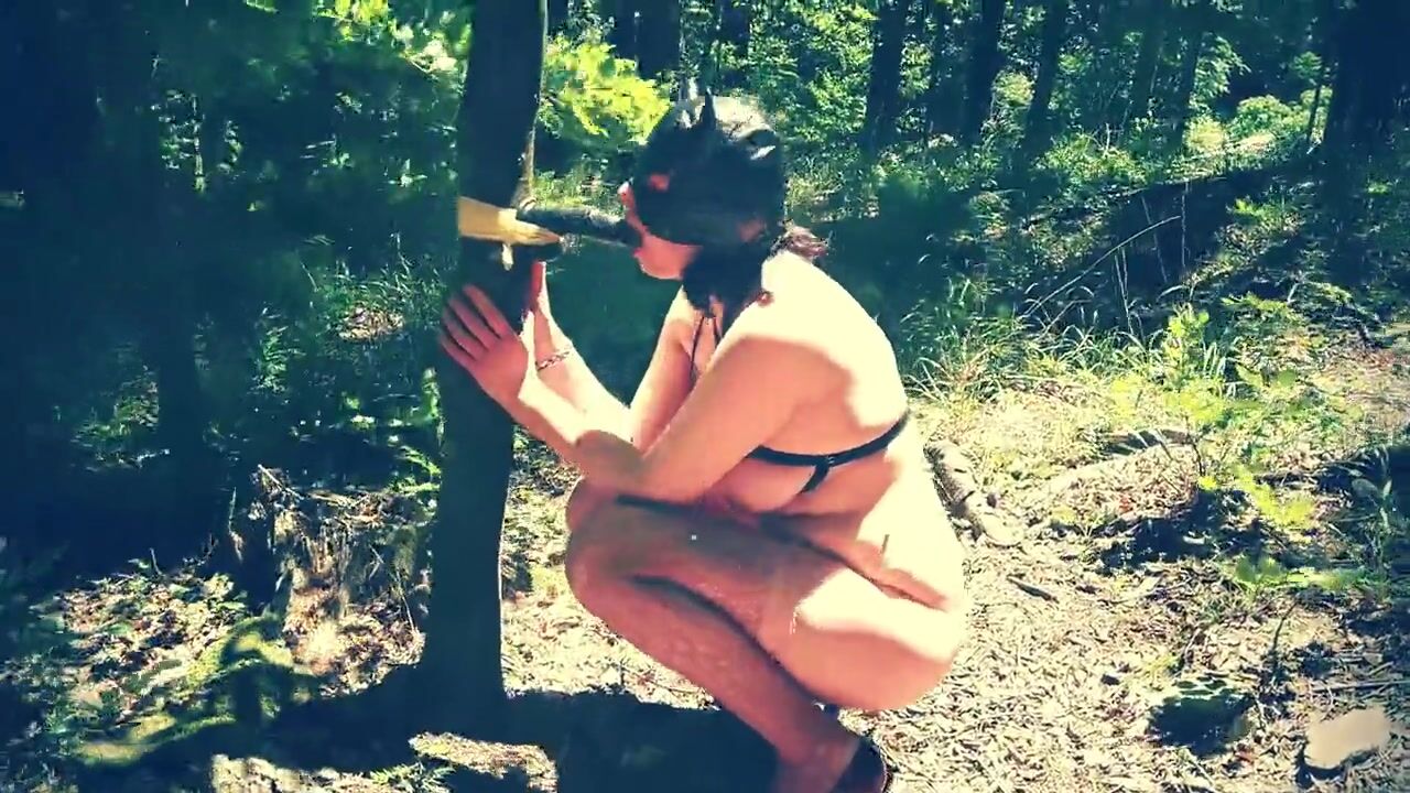 Beautiful slut totally naked in the forest sucking a dildo