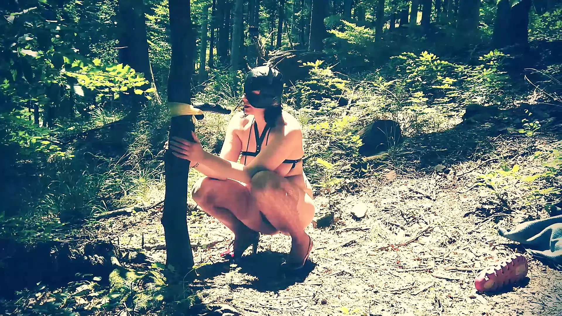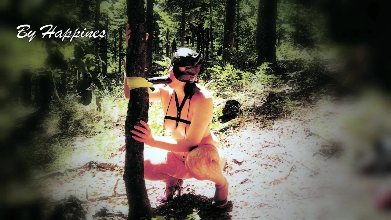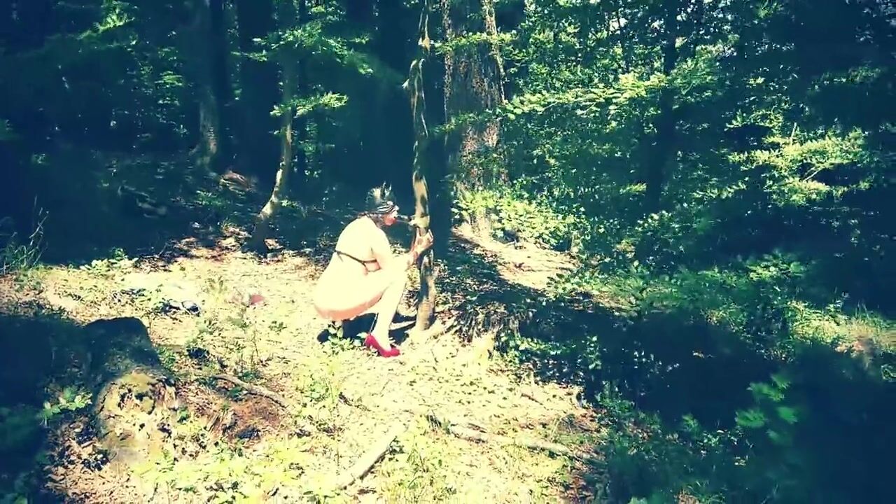 Beautiful slut totally naked in the forest sucking a dildo