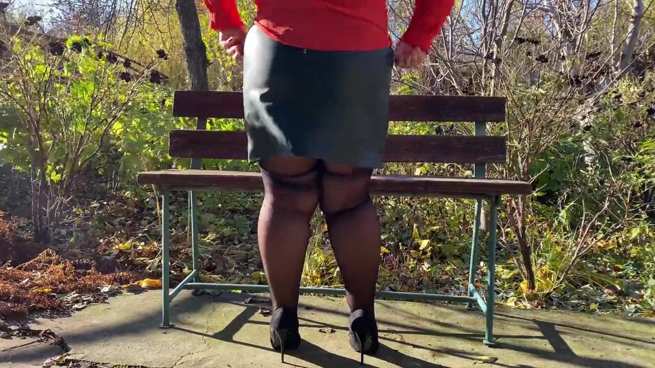 BBW in a leather skirt and pantyhose masturbates sitting on a bench