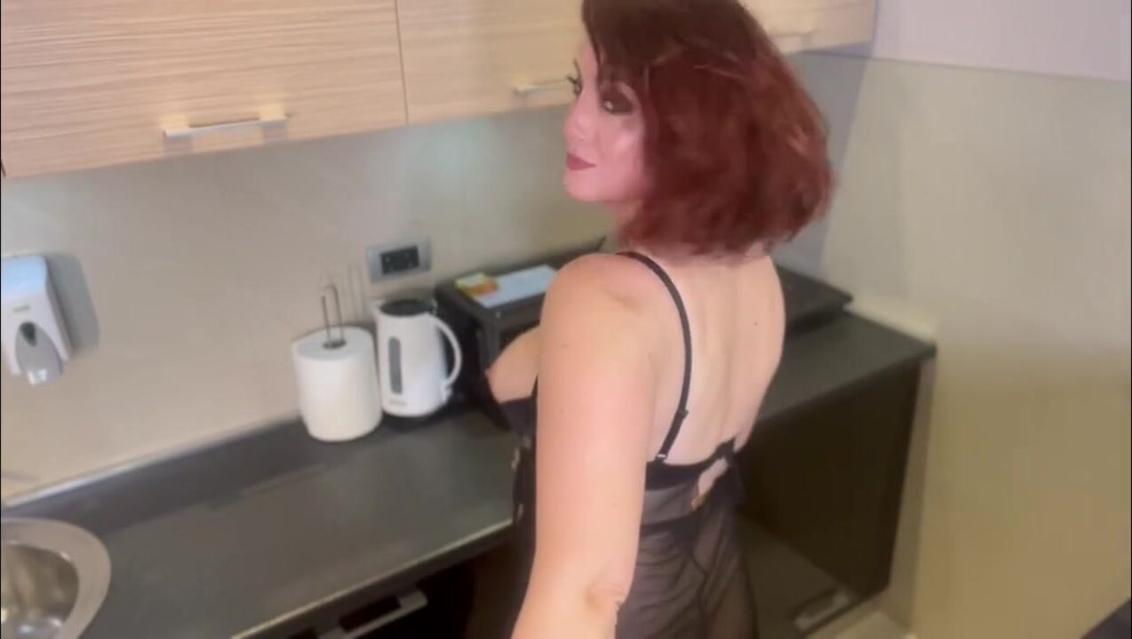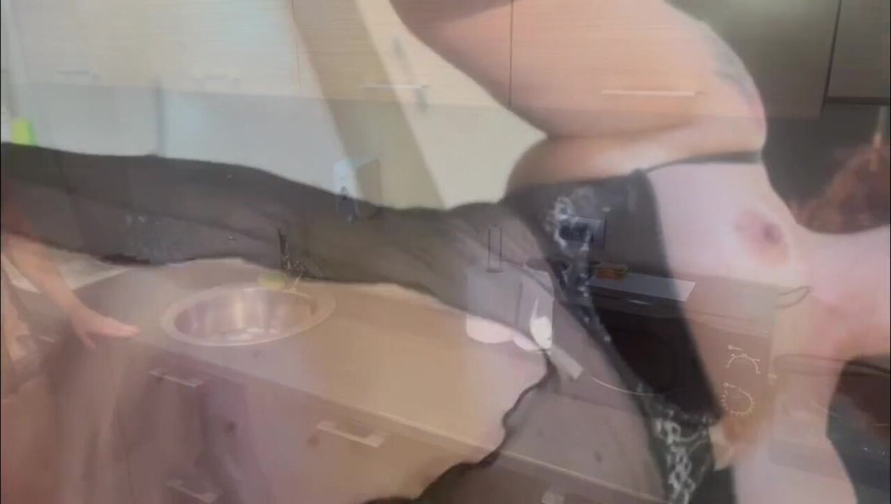 Redhead Milf Kitchen masturbation with huge glass dildo