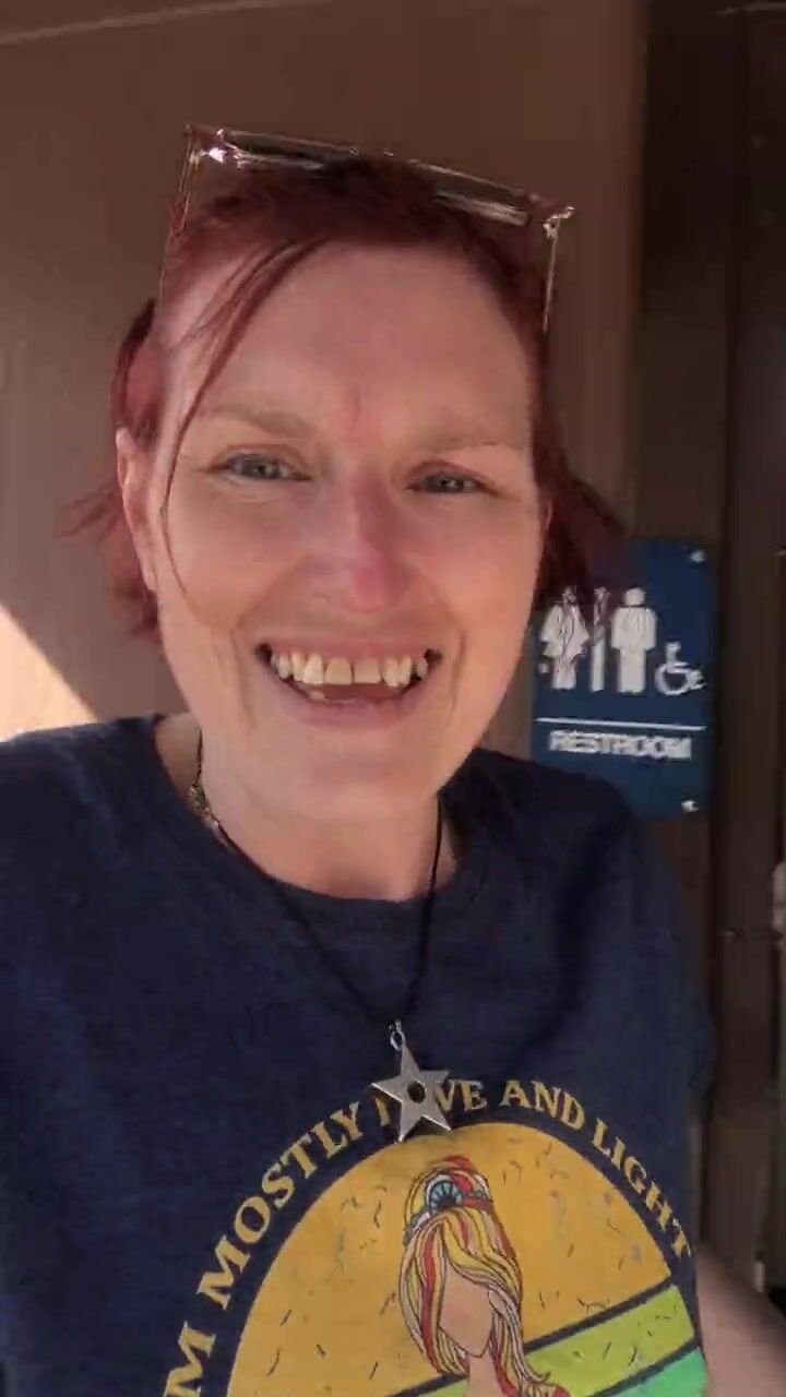 Fun hippy mom is bursting for the loo on a road trip