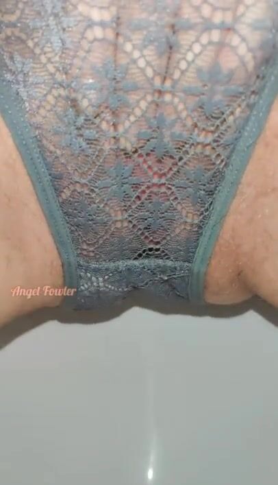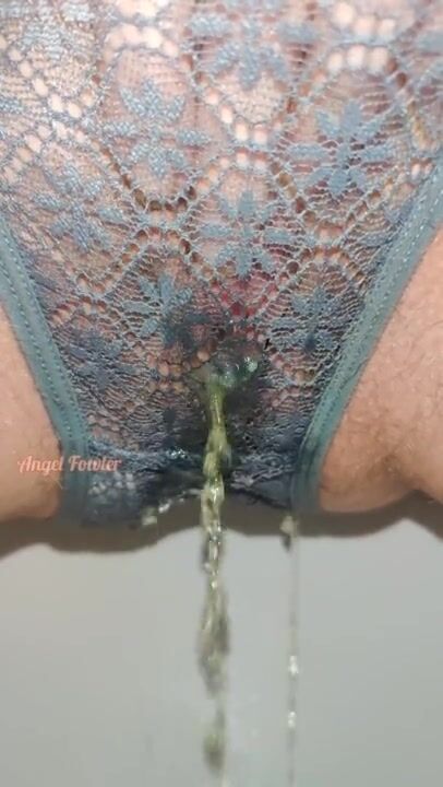 Yellow Pee in Grey lace panties close up