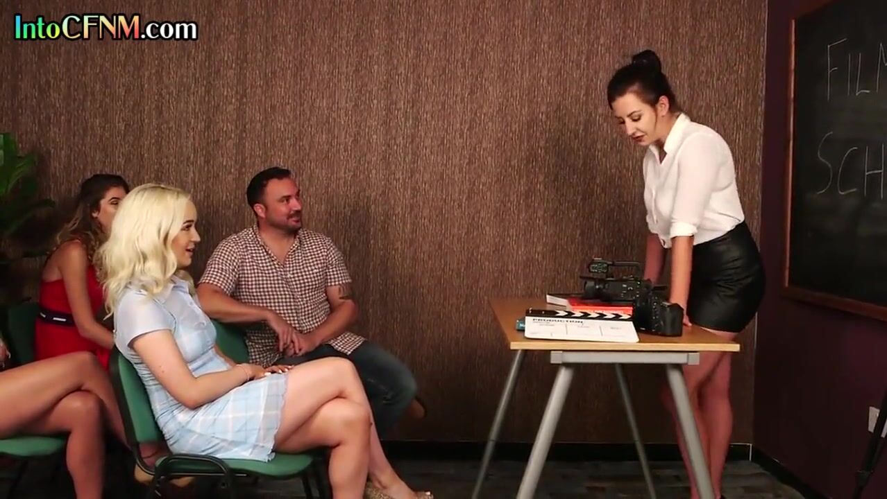 CFNM femdoms sucking and tugging guy cock in group action