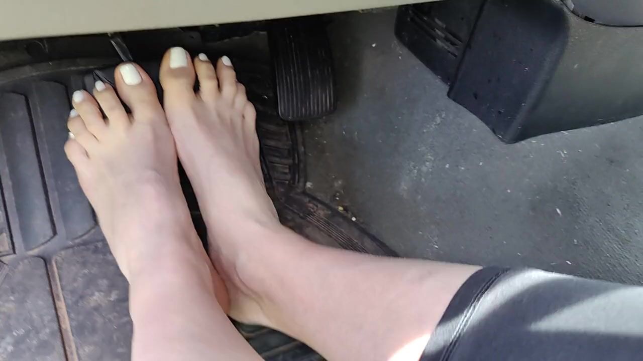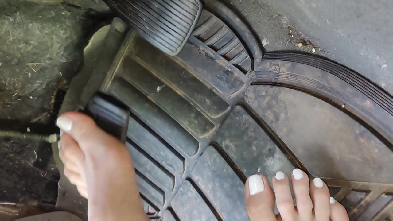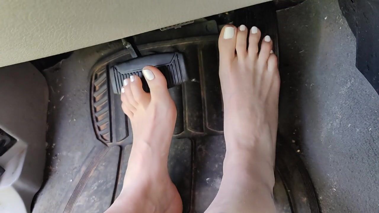 Pedal pumping barefooted in my big truck with white toe nails